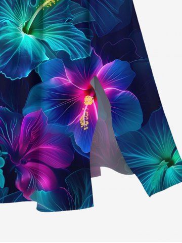 Plus Size Glitter Ombre Floral Tropical Leaves Print Hawaii Split Pocket A Line Midi Dress - Deep Blue - 5x