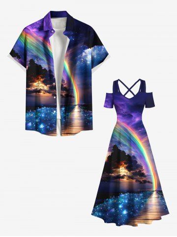 Plus Size Glitter Ombre Galaxy Aurora Dusk Sea Print Hawaii Cold Shoulder Crisscross A Line Maxi Dress - Purple - 3x