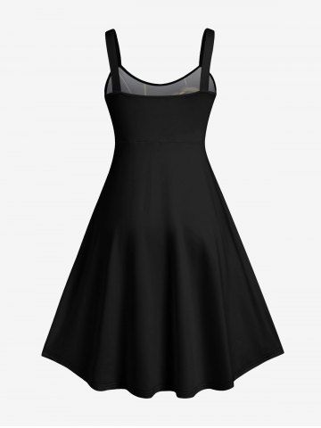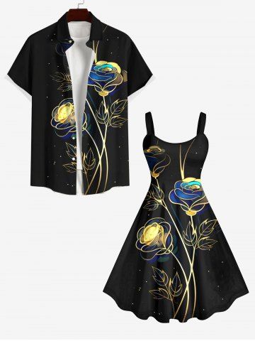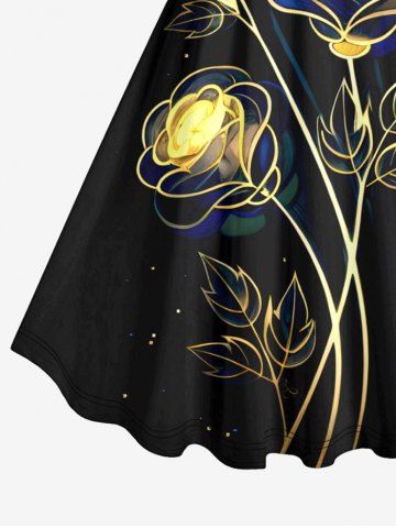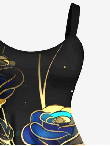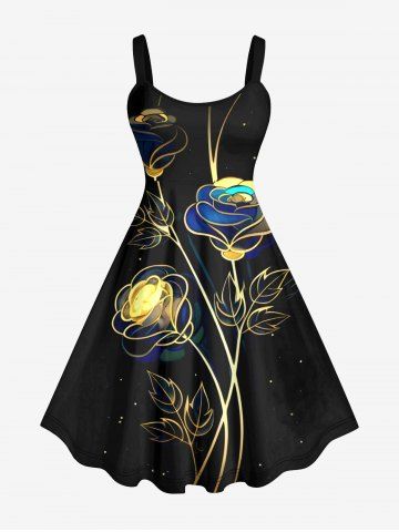 Plus Size Glitter Rose Flower Leaf Galaxy Print Hawaii A Line Tank Dress - Black - L