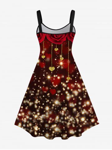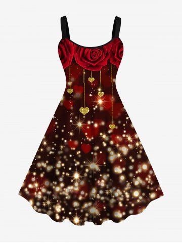 Plus Size Glitter Sparkling Rose Flower Heart Print Valentines Ombre A Line Tank Party Dress - Deep Red - 1x