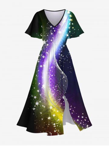Plus Size Glitter Sparkling Light Beam Curve Stars Galaxy Print Hawaii Split Pocket A Line Midi Dress - Black - 2x