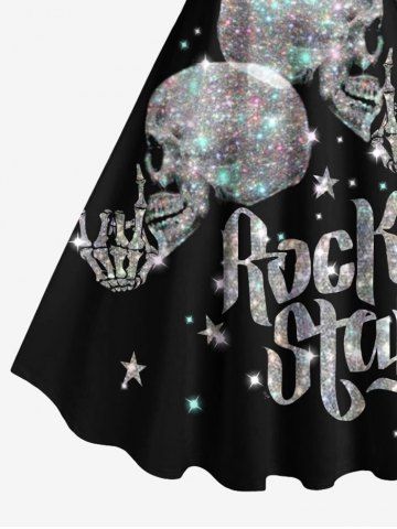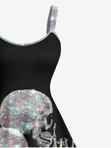 Plus Size Glitter Sparkling Skull Skeleton Letters Print Hawaii Music Rock A Line Tank Dress - Black - 2x