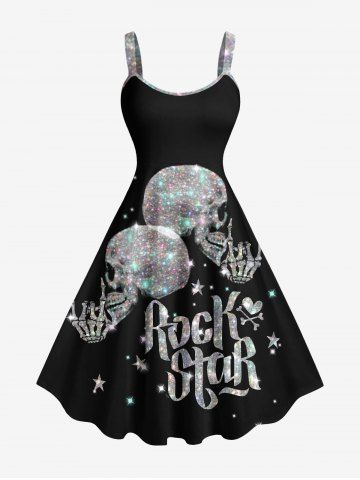 Plus Size Glitter Sparkling Skull Skeleton Letters Print Hawaii Music Rock A Line Tank Dress - Black - 5x