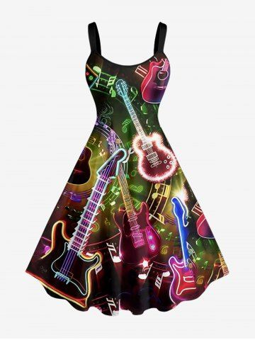 Plus Size Guitar Music Symbol Rock and Roll Print Hawaii A Line Dress - Black - Xxs
