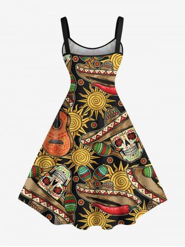 Plus Size Halloween Hat Skull Chili Sun Guitar Print Tank Dress - Yellow - M
