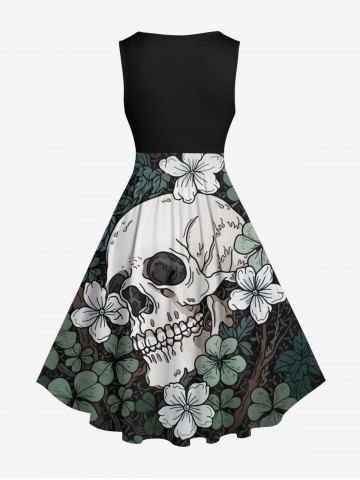 Graphic Dresses > Plus Size Halloween Skull Flowers Leaf Print 1950s Vintage Dress