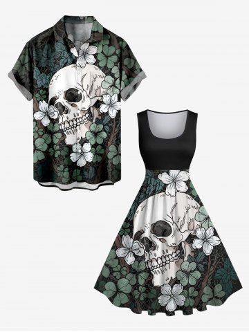 Graphic Dresses > Plus Size Halloween Skull Flowers Leaf Print 1950s Vintage Dress