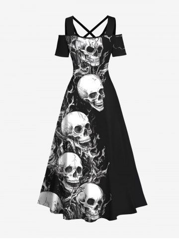 Graphic Dresses > Plus Size Halloween Skulls Print Cold Shoulder Crisscross Maxi Dress