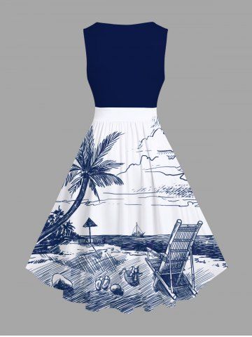 Plus Size Hand-painted Coconut Tree Sea Beach Seascape Cloud Print Hawaii Vintage Swing A Line Dress - Deep Blue - M