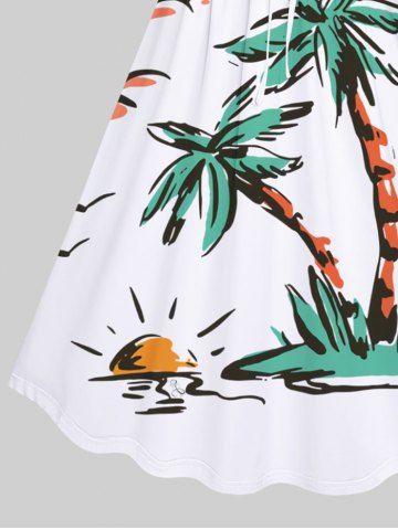 Plus Size Hand Painting Coconut Tree Sun Swallow Print Hawaii Cinched A Line Dress - White - M