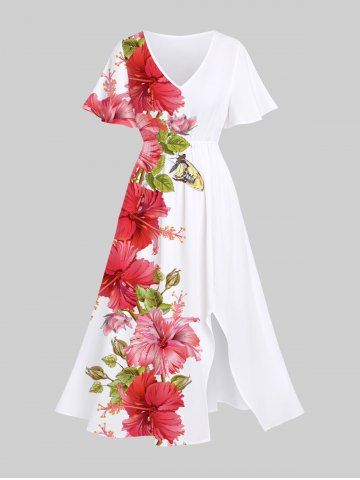 Graphic Dresses > Plus Size Hibiscus Flower Butterfly Print Split Hawaii Midi Dress