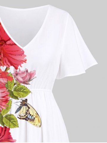 Plus Size Hibiscus Flower Butterfly Print Split Hawaii Midi Dress - White - S