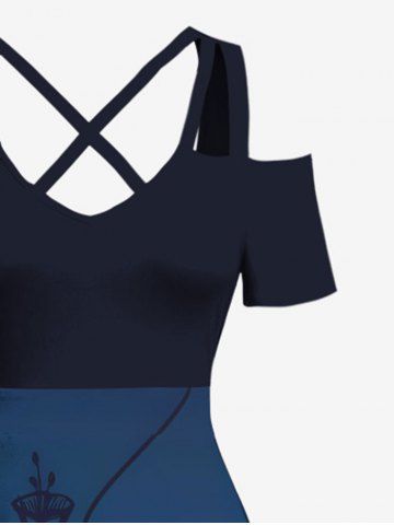 Plus Size Hibiscus Flower Ethnic Graphic Print Hawaii Cold Shoulder Crisscross A Line Maxi Dress - Blue - Xxs
