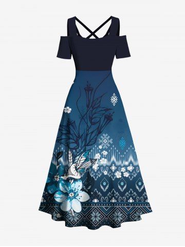 Graphic Dresses > Plus Size Hibiscus Flower Ethnic Graphic Print Hawaii Cold Shoulder Crisscross A Line Maxi Dress