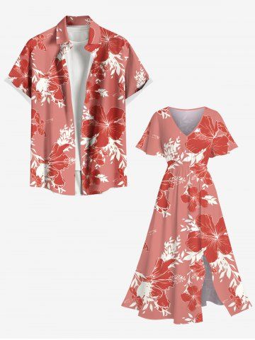 Plus Size Hibiscus Flower Leaf Branch Print Hawaii Split Pocket A Line Midi Dress - Red - Xs