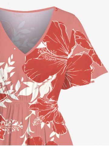 Plus Size Hibiscus Flower Leaf Branch Print Hawaii Split Pocket A Line Midi Dress - Red - 1x