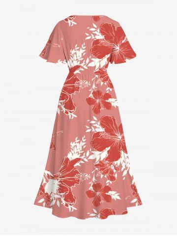 Plus Size Hibiscus Flower Leaf Branch Print Hawaii Split Pocket A Line Midi Dress - Red - 2x