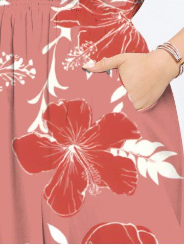 Plus Size Hibiscus Flower Leaf Branch Print Hawaii Split Pocket A Line Midi Dress - Red - 3x