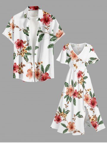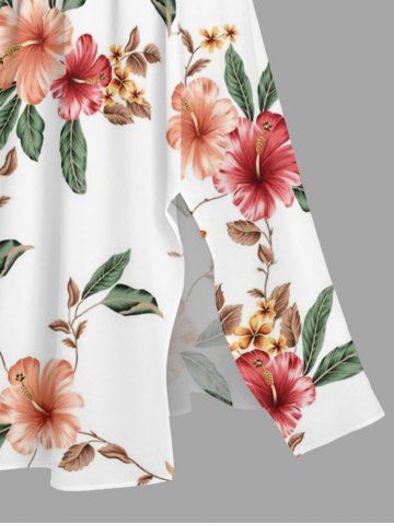 Plus Size Hibiscus Flower Leaf Branch Print Hawaii Split Pocket A Line Midi Dress - White - Xxs