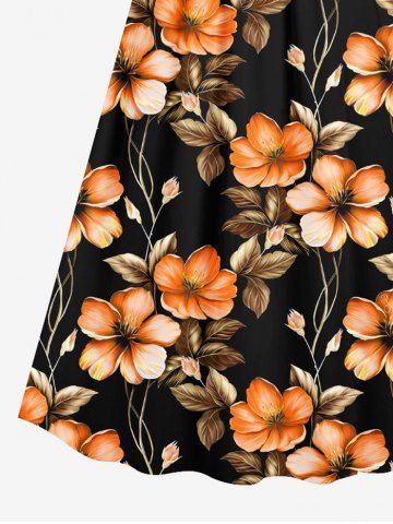 Plus Size Hibiscus Flower Leaf Branch Print Hawaii Surplice A Line Cami Dress - Black - 3x
