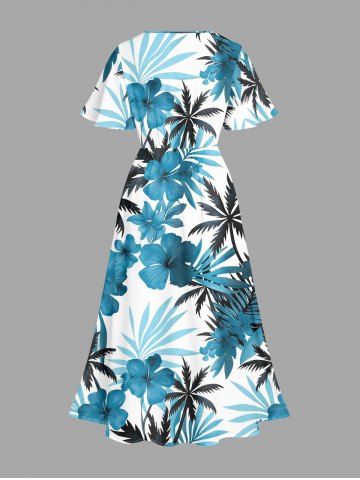 Plus Size Hibiscus Flower Leaf Coconut Tree Print Split Hawaii Midi Dress - Light Blue - Xs
