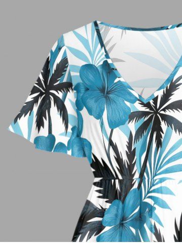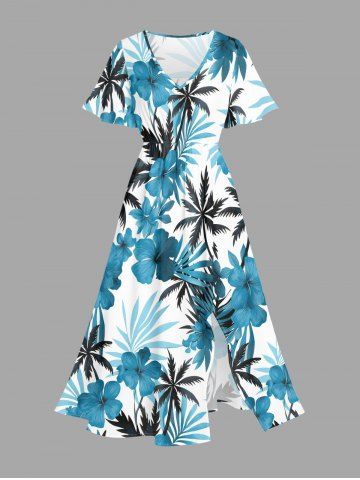 Plus Size Hibiscus Flower Leaf Coconut Tree Print Split Hawaii Midi Dress - Light Blue - M