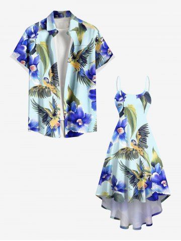 Plus Size Hibiscus Flower Leaf Parrot Print Hawaii High Low Asymmetric Cami Dress - Light Blue - Xs