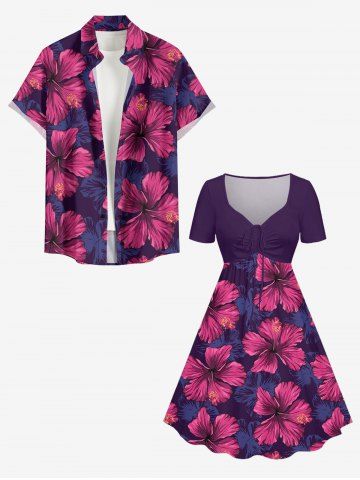 Plus Size Hibiscus Flower Leaf Print Cinched Hawaii Dress - Purplish Red - S