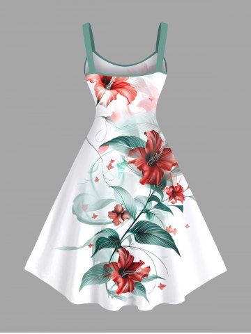 Plus Size Hibiscus Flower Leaf Print Hawaii Tank Dress - White - 6x