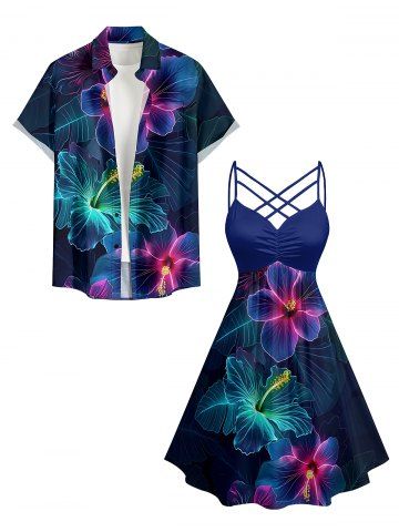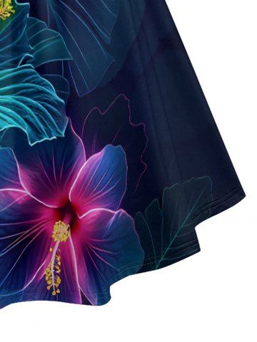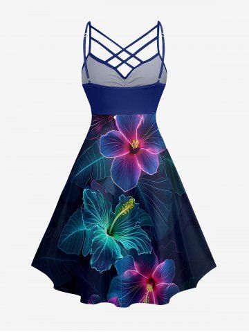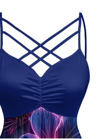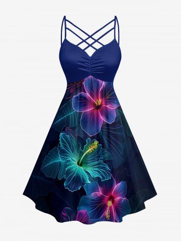 Plus Size Hibiscus Flower Leaf Print Ruched Lattice Crisscross Straps Hawaii Dress - Deep Blue - L