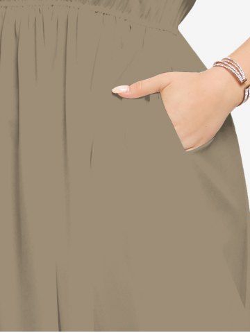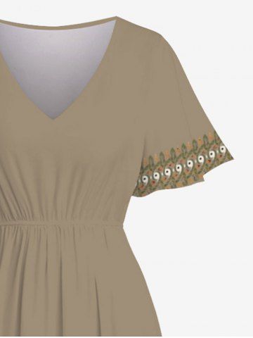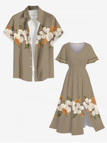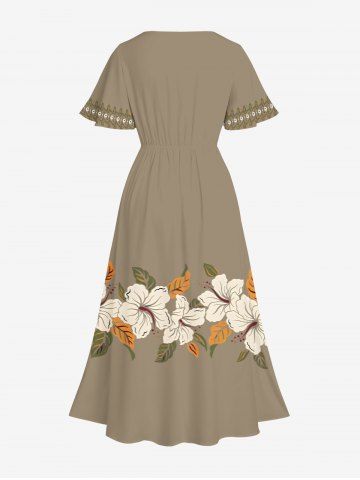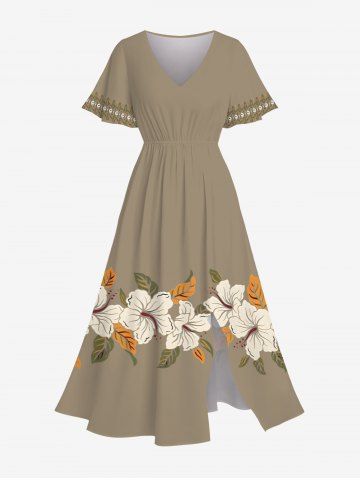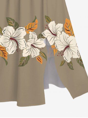 Plus Size Hibiscus Flower Leaf Print Split Hawaii Midi Dress - Tan - 3x