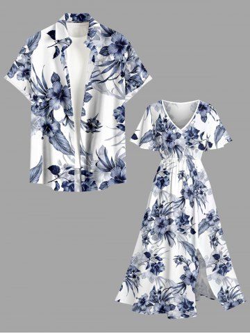 Plus Size Hibiscus Flower Leaf Print Split Hawaii Midi Dress - Cadetblue - Xs