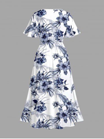 Plus Size Hibiscus Flower Leaf Print Split Hawaii Midi Dress - Cadetblue - M
