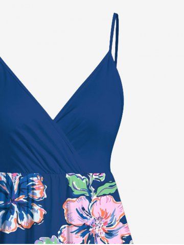 Plus Size Hibiscus Flower Leaf Print Surplice Hawaii Cami Dress - Blue - Xs