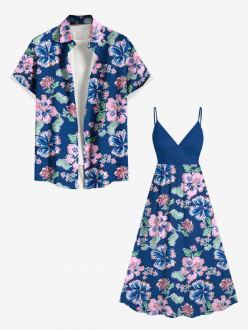 Plus Size Hibiscus Flower Leaf Print Surplice Hawaii Cami Dress - Blue - S