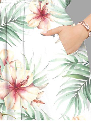 Plus Size Hibiscus Flower Tropial Leaf Print Split Hawaii Midi Dress - White - 1x