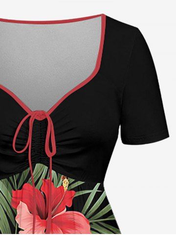 Plus Size Hibiscus Flower Tropical Leaf Print Cinched Hawaii Dress - Black - Xs