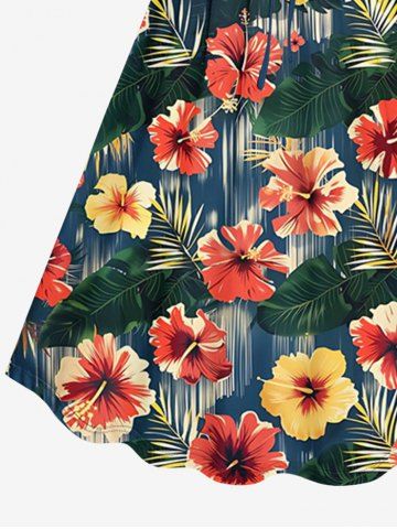Plus Size Hibiscus Flower Tropical Leaf Print Cinched Hawaii Dress - Cadetblue - Xxs