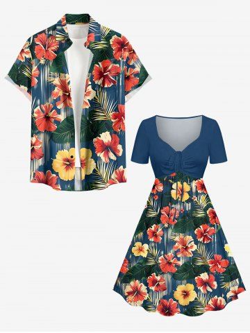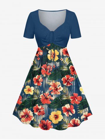 Plus Size Hibiscus Flower Tropical Leaf Print Cinched Hawaii Dress - Cadetblue - Xs