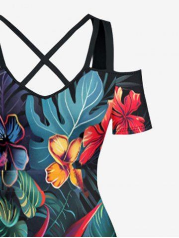 Plus Size Hibiscus Flower Tropical Leaf Print Cold Shoulder Crisscross Hawaii Maxi Dress - Black - Xs