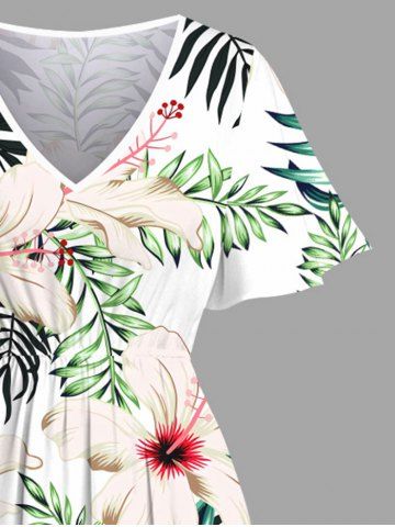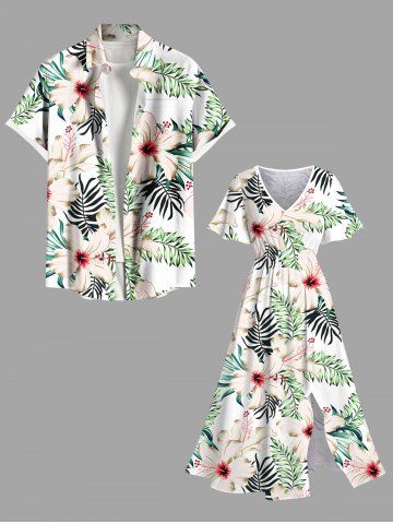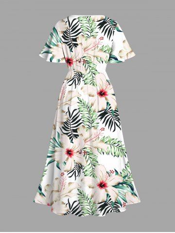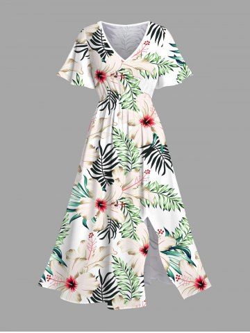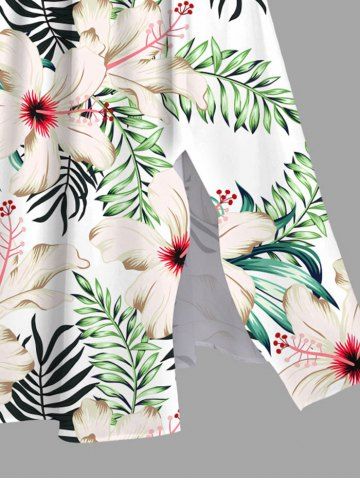 Plus Size Hibiscus Flower Tropical Leaf Print Split Hawaii Midi Dress - White - S