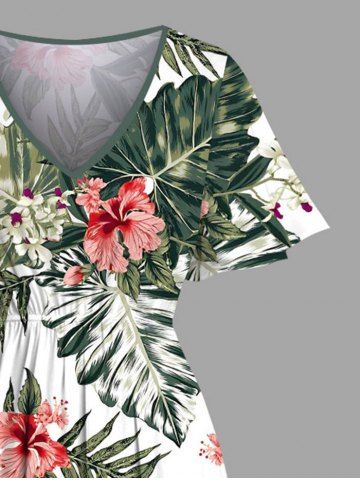 Plus Size Hibiscus Flower Tropical Leaf Print Split Hawaii Midi Dress - Green - M