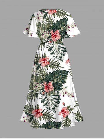 Plus Size Hibiscus Flower Tropical Leaf Print Split Hawaii Midi Dress - Green - 4x