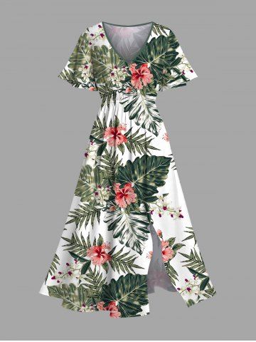 Plus Size Hibiscus Flower Tropical Leaf Print Split Hawaii Midi Dress - Green - 5x