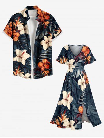 Graphic Dresses > Plus Size Hibiscus Flower Tropical Leaf Print Split Hawaii Midi Dress