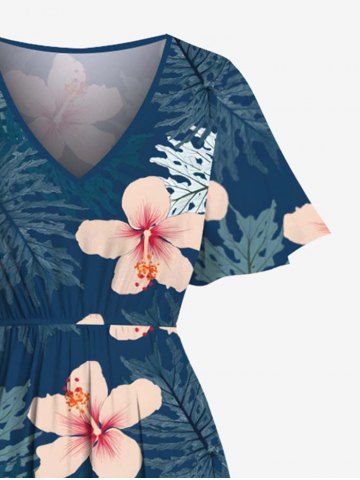 Plus Size Hibiscus Flower Tropical Leaf Print Split Hawaii Midi Dress - Peacock Blue - Xxs