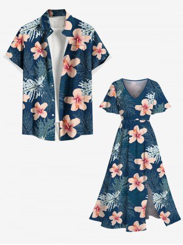 Plus Size Hibiscus Flower Tropical Leaf Print Split Hawaii Midi Dress - Peacock Blue - 1x