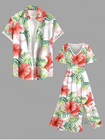 Plus Size Hibiscus Flower Tropical Leaf Print Split Hawaii Midi Dress - White - 2x