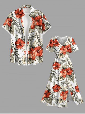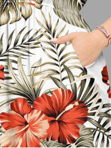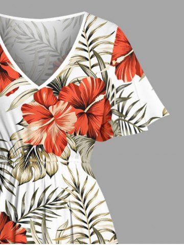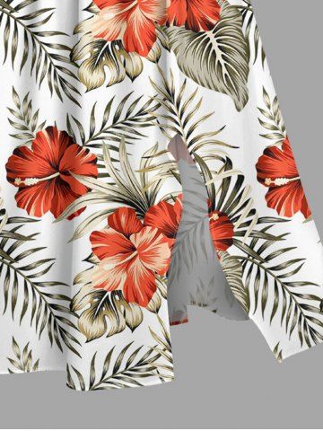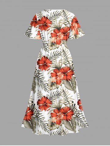 Plus Size Hibiscus Flower Tropical Leaf Print Split Hawaii Midi Dress - White - Xxs