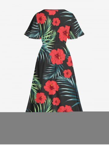 Plus Size Hibiscus Flower Tropical Leaf Print Split Hawaii Midi Dress - Black - Xs
